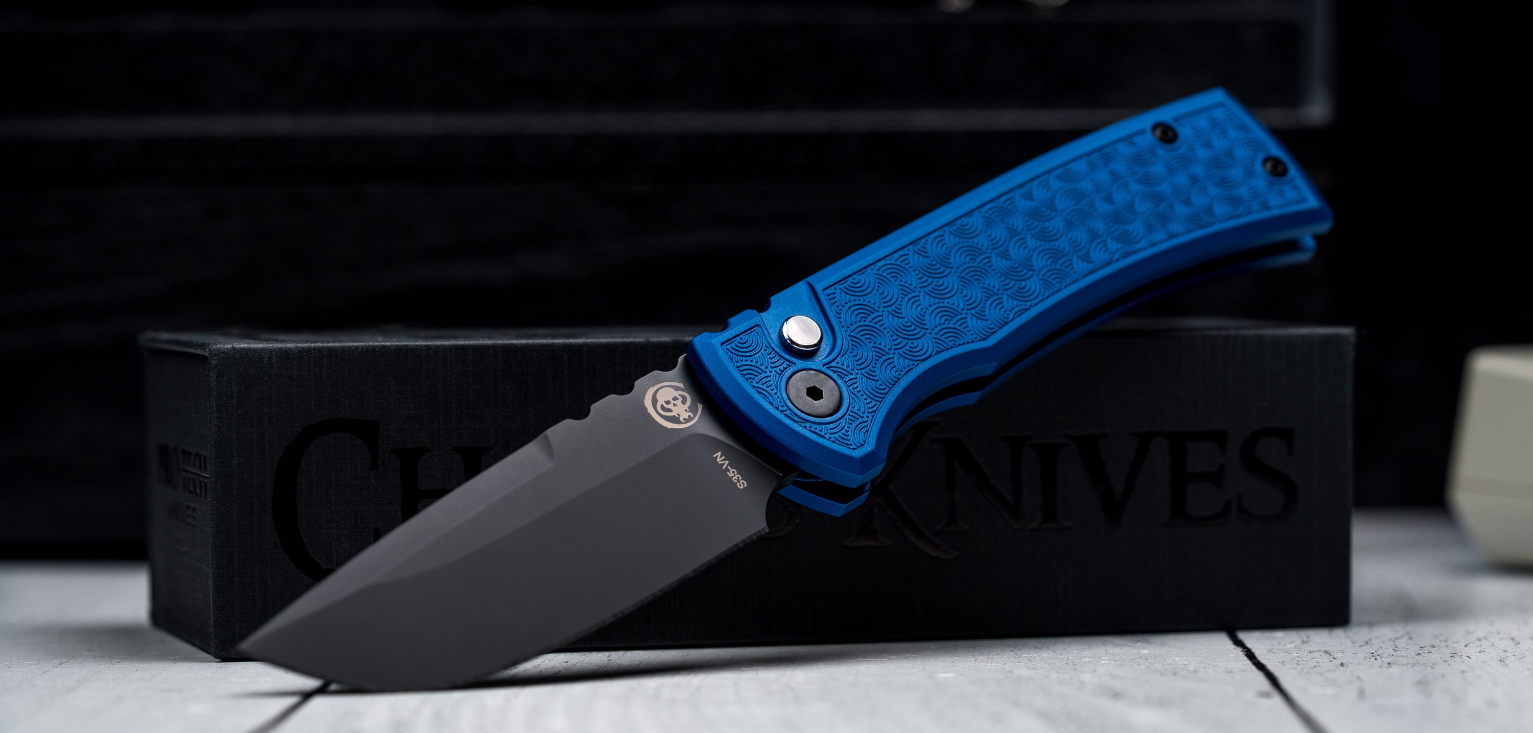 Chaves x Pro-Tech x URBAN Redencion 229 - Black DLC S35VN & Blue Aluminum w/ Chaos Seigaiha™